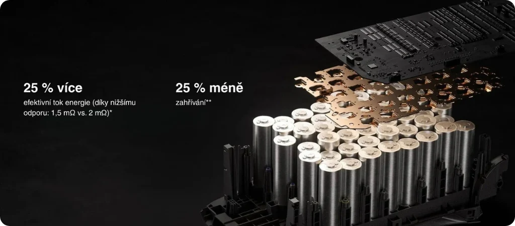 **Vnitřní odpor jednoho článku je snížen o 25 %, což podle vztahu Q = I²Rt znamená, že při stejném proudu vzniká až o 25 % méně tepla.