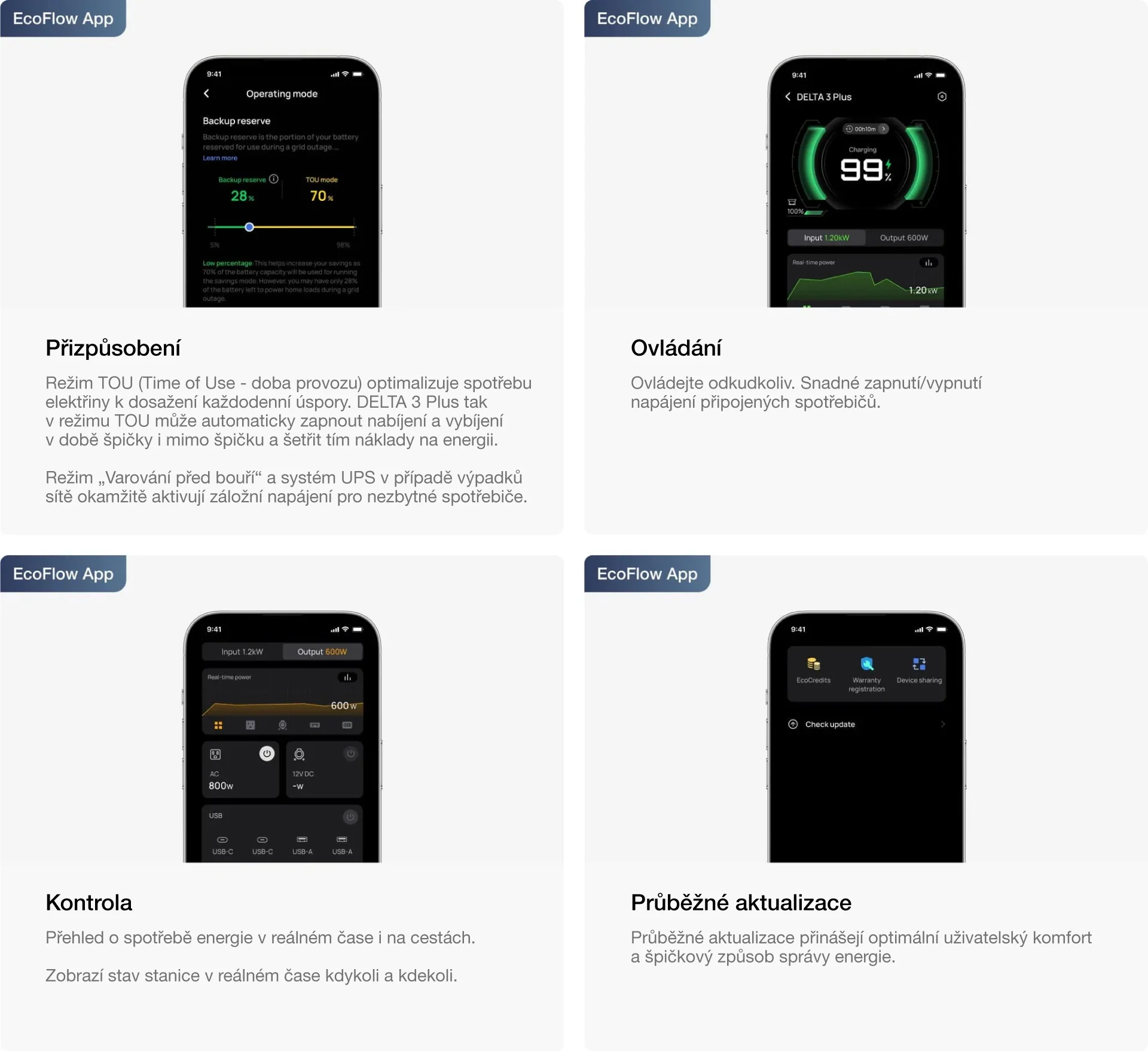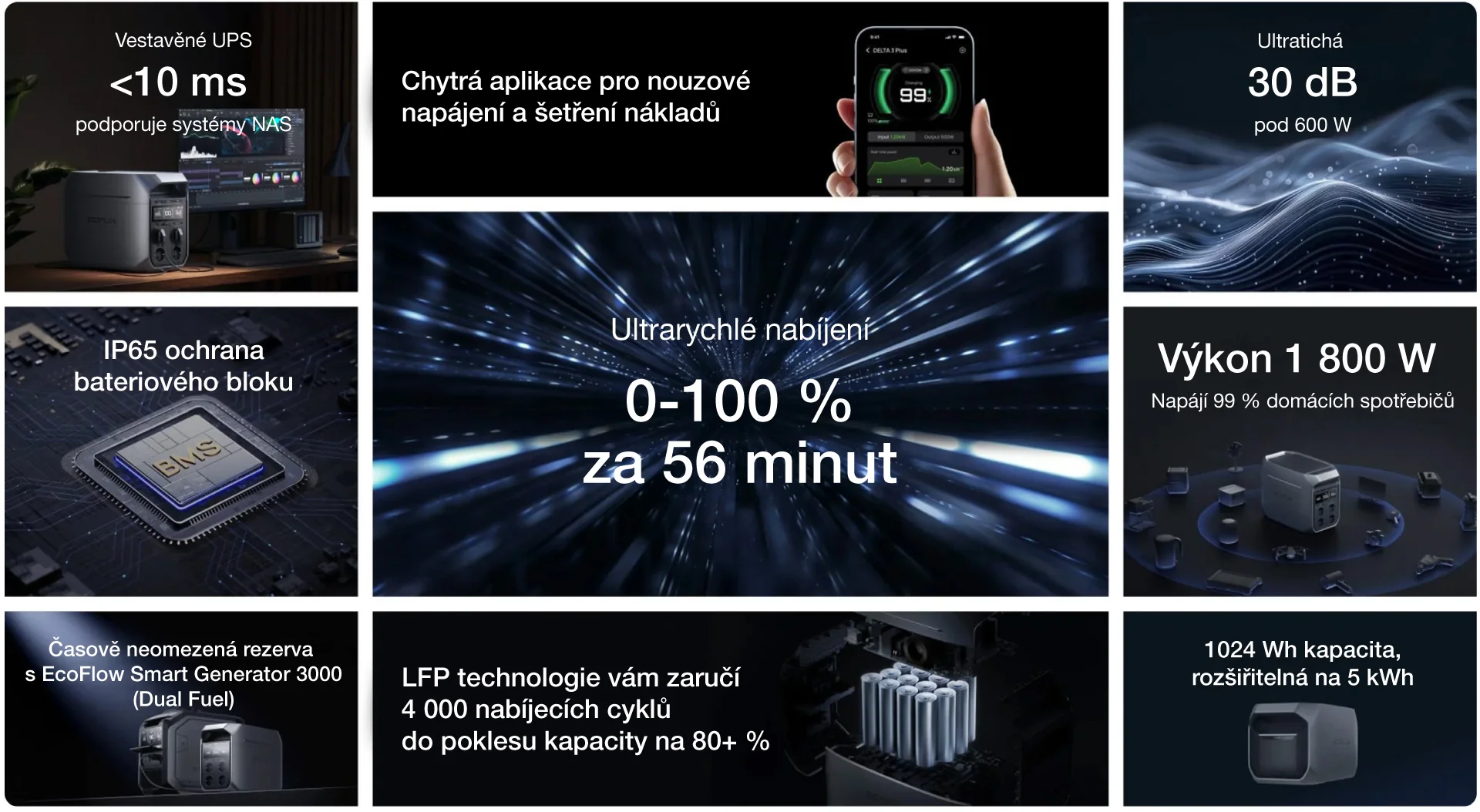 EcoFlow DELTA 3 Plus je bateriová stanice s akumulátorem LiFePO₄ a kapacitou 1024 Wh. Má několik výstupů, včetně standardních zásuvek střídavého proudu, portů USB-A, portů USB-C, 12V DC portů a portu pro přídavnou baterii, kterými lze napájet celou řadu spotřebičů a zařízení. Různé možnosti nabíjení umožňují využívat jednotlivé způsoby podle aktuálních potřeb. Stanice tedy představuje nejen velmi spolehlivý, ale zároveň i velmi flexibilní zdroj energie. Disponuje i velmi prostornou obrazovkou, která přehledně zobrazuje informace o jejím aktuálním provozu.