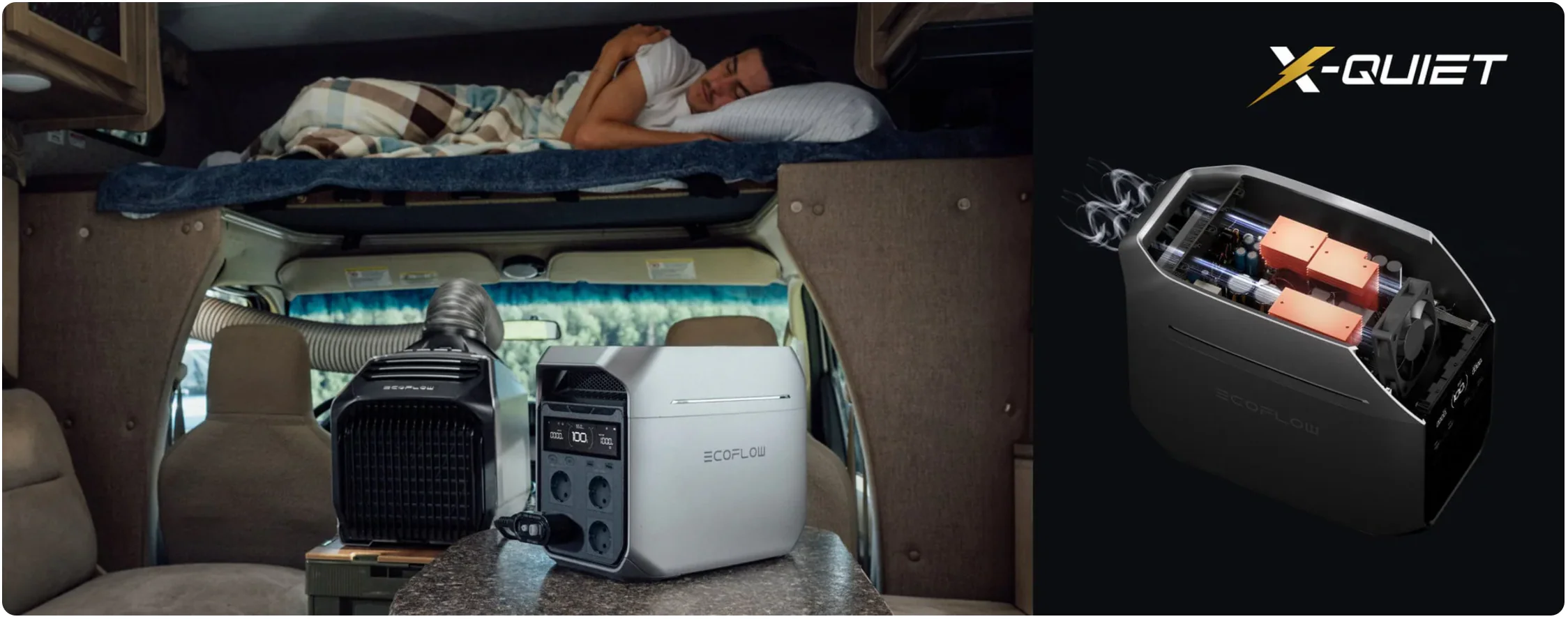 Téměř neslyšitelná pod 600 W, plně splývající s přirozeným okolním hlukem (30 dB). Ať už jste ve stanu nebo doma, váš spánek rušit nebude.