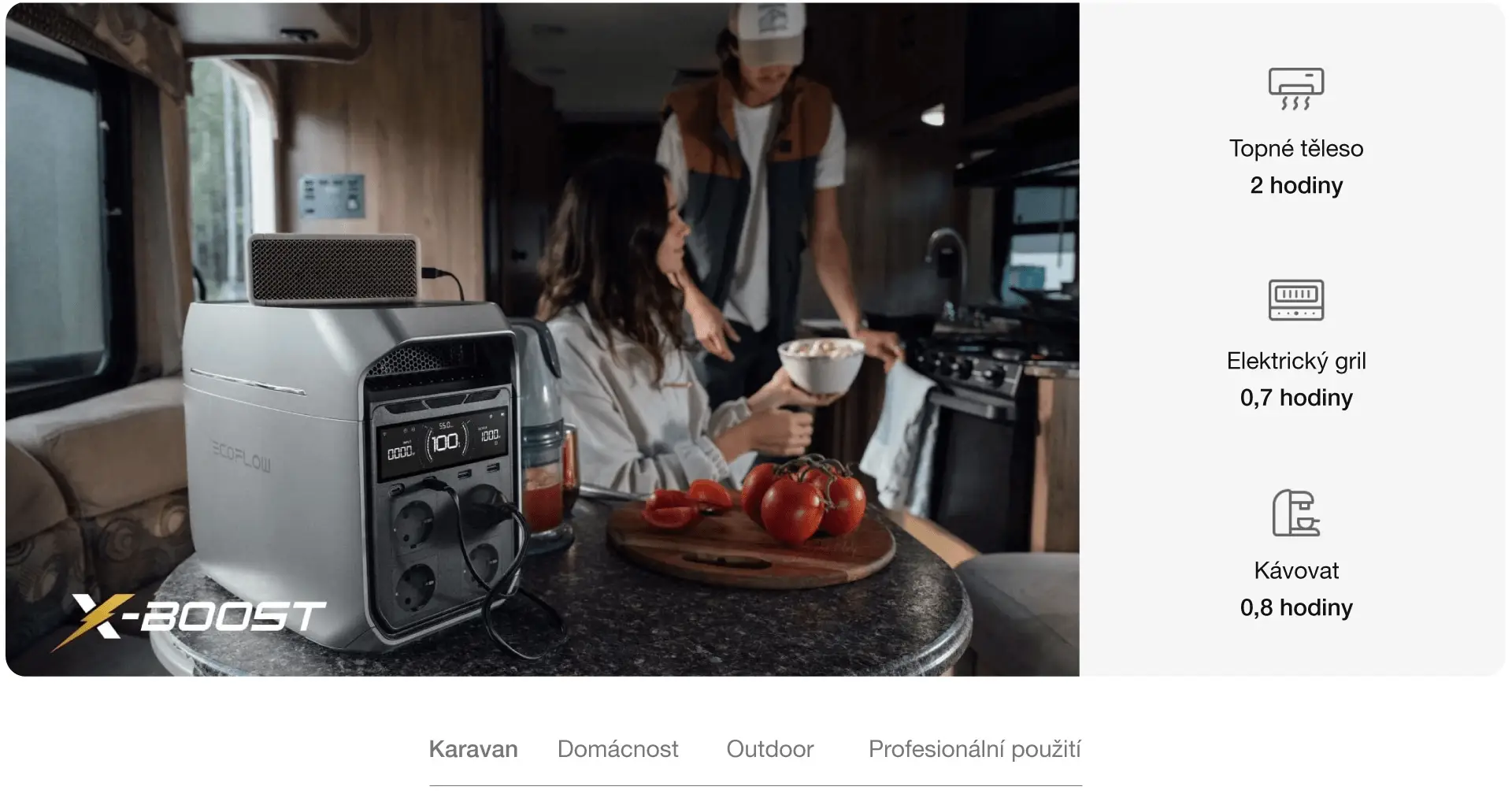 Řada EcoFlow DELTA 3 pohání 99 % domácích spotřebičů, včetně chladniček, televizorů a počítačů. Navíc díky funkci X-Boost může nepřetržitě napájet některé spotřebiče s výkonem do 2400 W, například trouby (2150 W), fény (1800-2500 W) a rychlovarné konvice (1200-3000 W). Tato stanice s možností solárního nabíjení zajistí, že v domácnosti, obytném voze ani venku nikdy nezůstanete ve tmě.